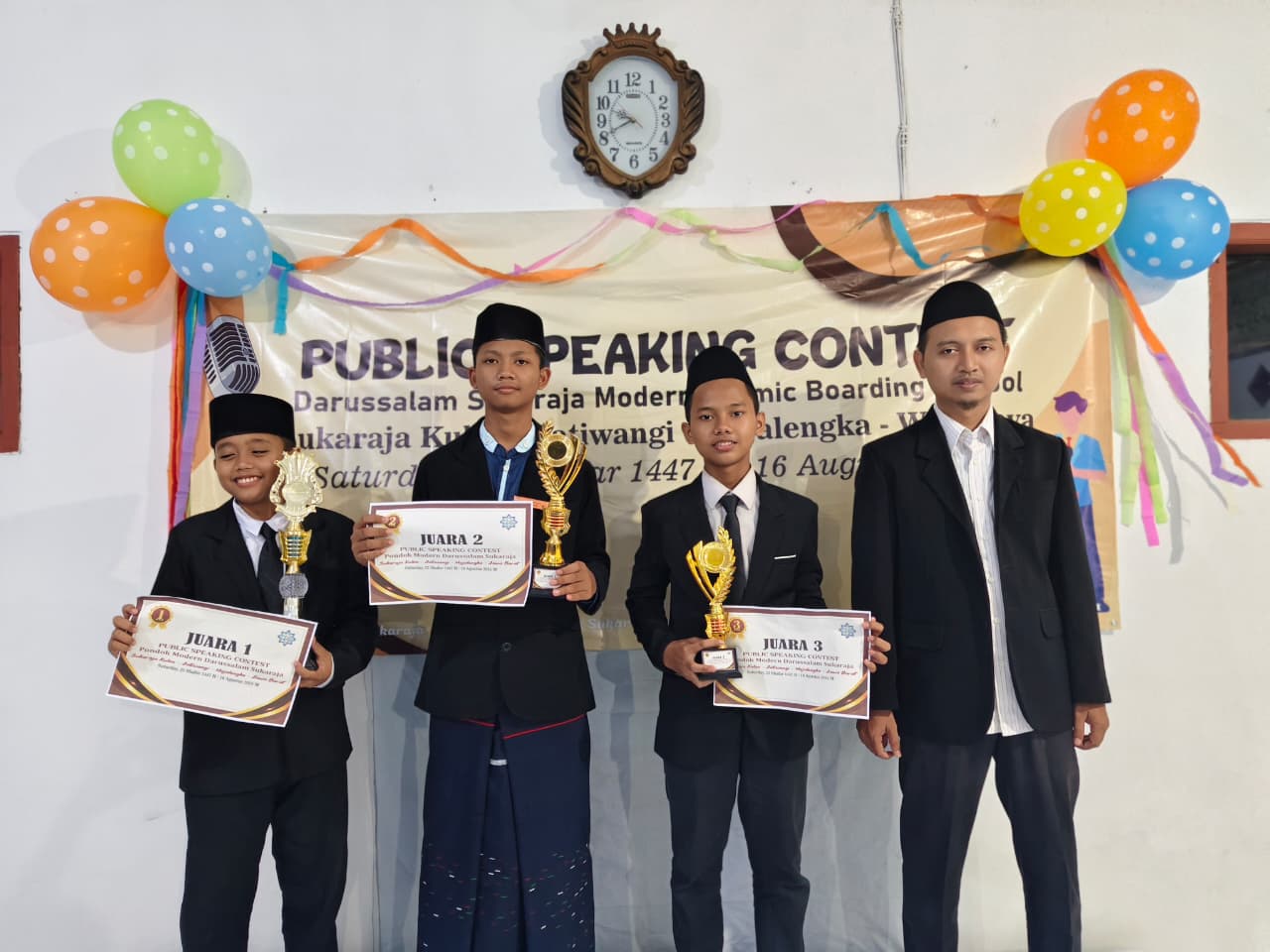 Dalam penampilannya, para peserta menunjukkan keberanian, keterampilan berpidato, serta penguasaan materi dengan penuh semangat. Setelah melalui penilaian ketat, akhirnya dewan juri menetapkan tiga santri terbaik. Juara pertama diraih oleh Cakra Samudra (kelas 1), disusul oleh Putra Dwi Norival (kelas 4) sebagai juara kedua, dan Umay Maulana Yusuf (kelas 4) sebagai juara ketiga.
